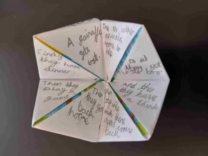 This time I worked with two classes and we made chatterboxes – a simple origami which can be a fun way to generate story ideas. We used our chatterboxes to develop characters, plot and setting. I look forward to hearing about the finished stories Parkway – I loved working with you on your plans!